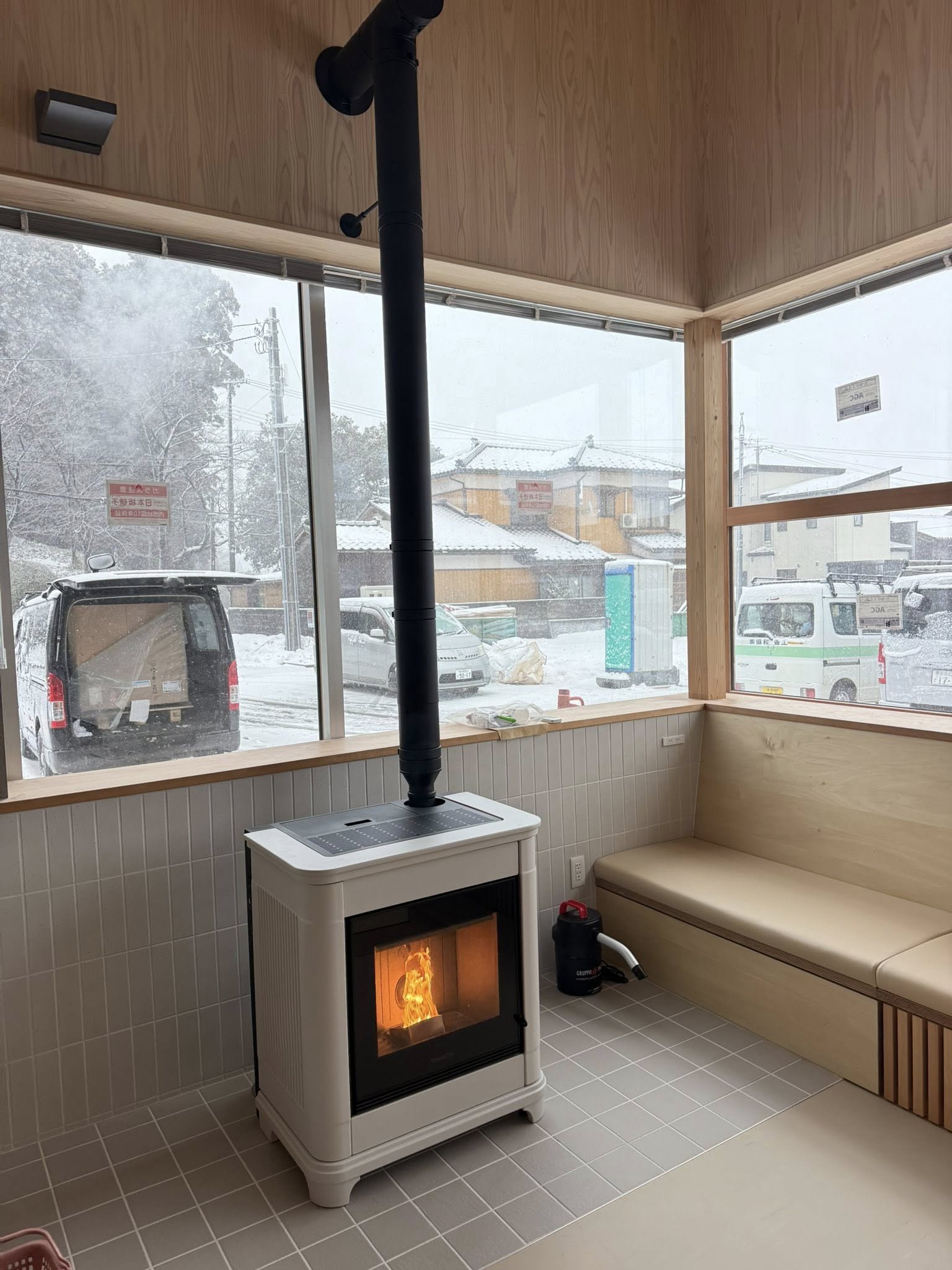 温風ダクトを2つに分けて、ストーブ前面の他、
